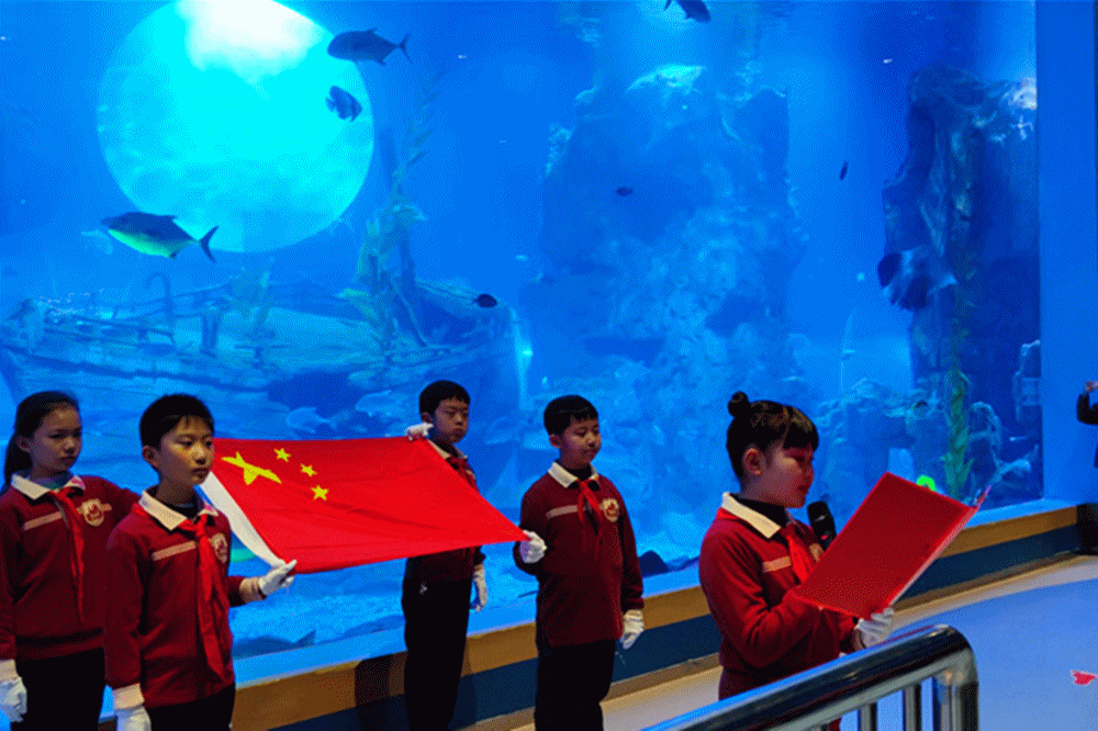 假期首日,西寧海洋世界用“海底升國旗”的方式向祖國獻禮。伴隨著莊嚴的國歌聲,五星紅旗從海底緩緩升起。隨后,游客們齊唱《我和我的祖國》。嘹亮的歌聲回蕩在海洋館內,使人熱血沸騰。
